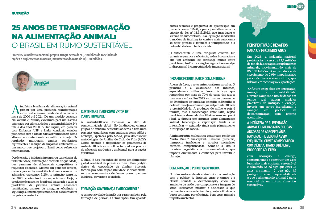 Em 2025, a indústria nacional projeta atingir cerca de 93,7 milhões de toneladas de rações e suplementos minerais, movimentando mais de R$ 180 bilhões. Pág. 34
