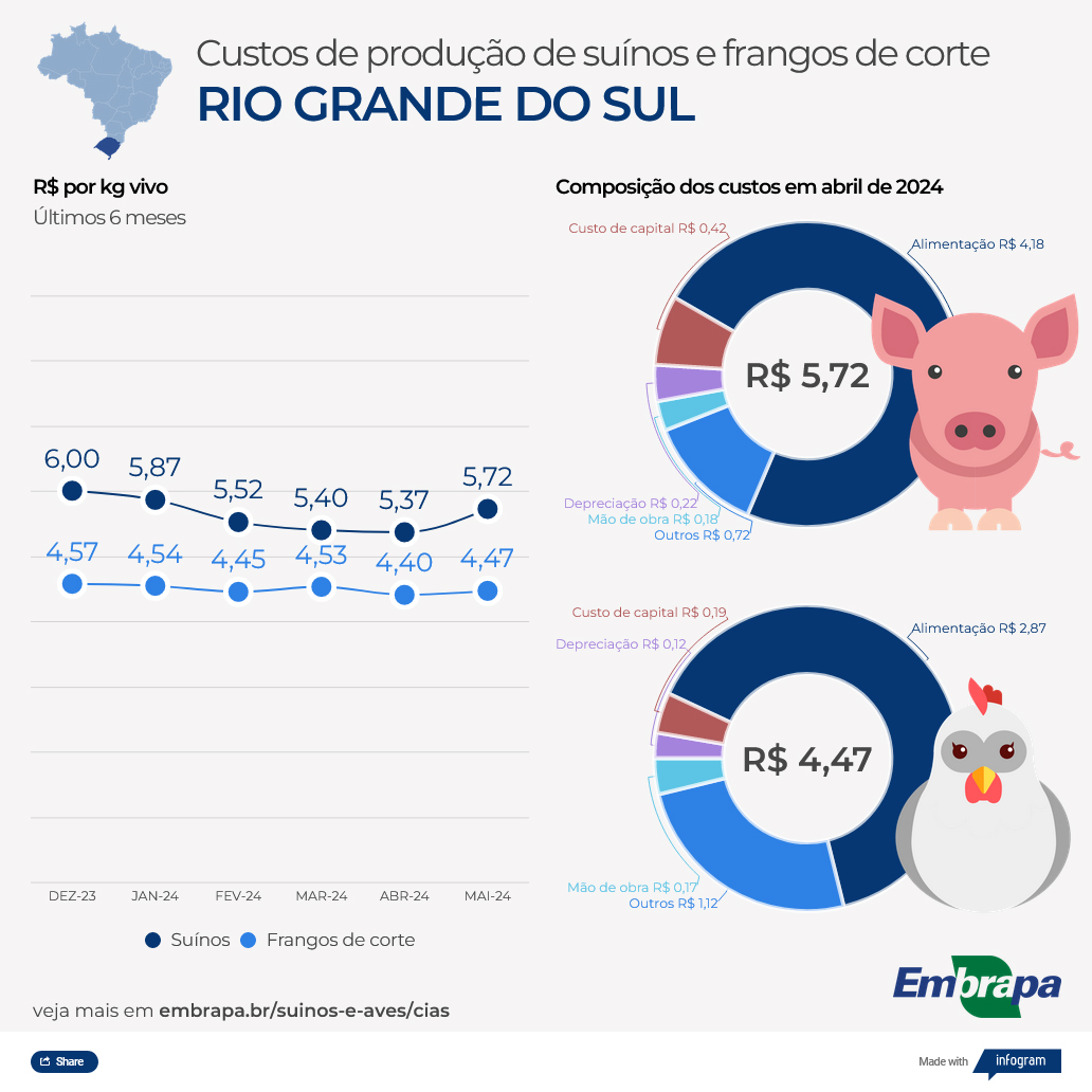 Os custos de produção de frangos de corte e suínos registraram aumento no mês de maio nos principais estados produtores e exportadores, conforme estudos conduzidos pela Embrapa Suínos e Aves através de sua Central de Inteligência de Aves e Suínos (embrapa.br/suínos-e-aves/cias).