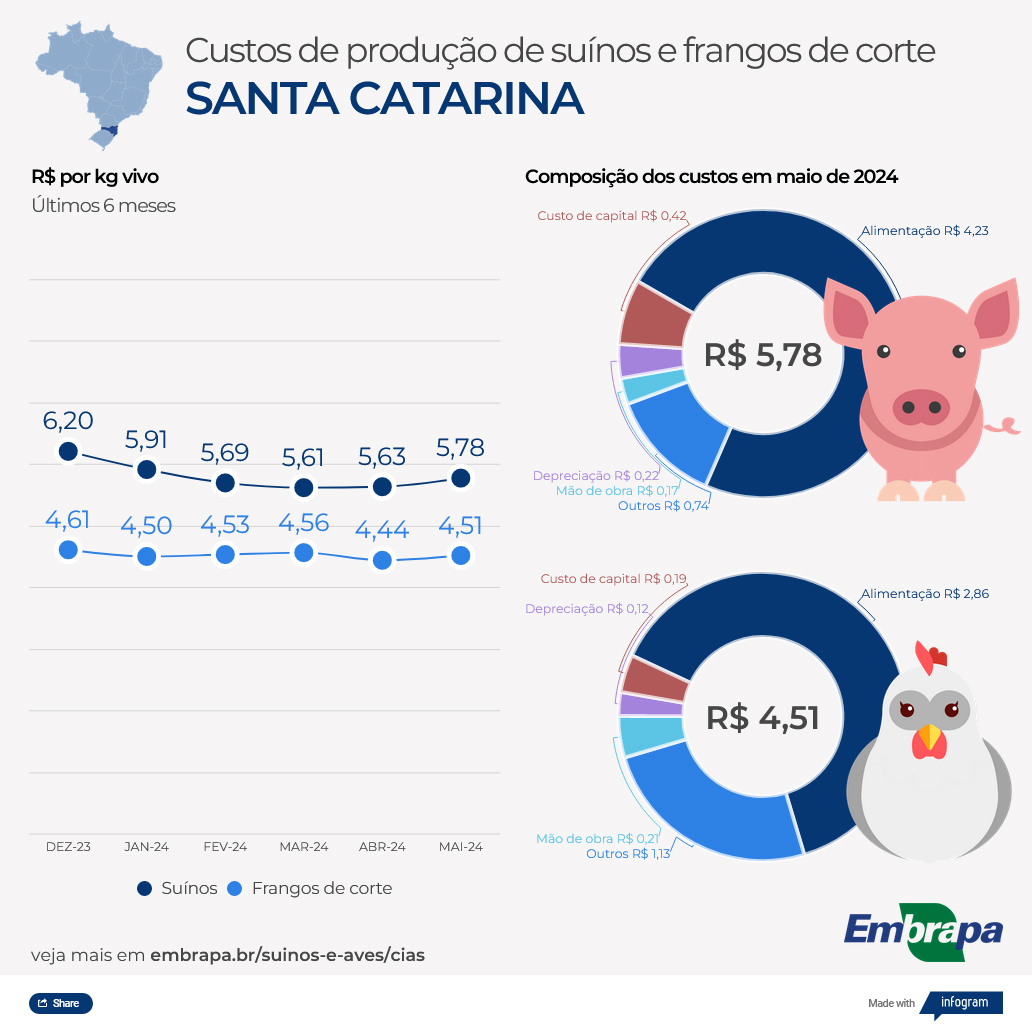Em Santa Catarina, o custo de produção do quilo de suíno vivo alcançou R$ 5,78, um aumento de +2,69% em comparação a abril, mas ainda com uma queda acumulada no ano (-6,87%) e nos últimos 12 meses (-0,83%), com o ICPSuíno atingindo 330,50 pontos. Os custos com rações e juros sobre o capital investido e de giro foram determinantes, com aumentos de +3,29% e +3,37%, respectivamente.