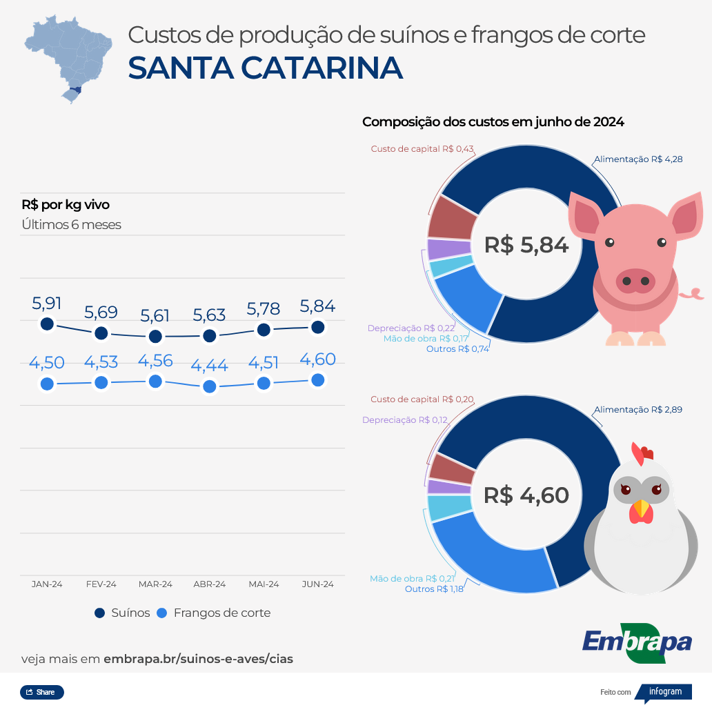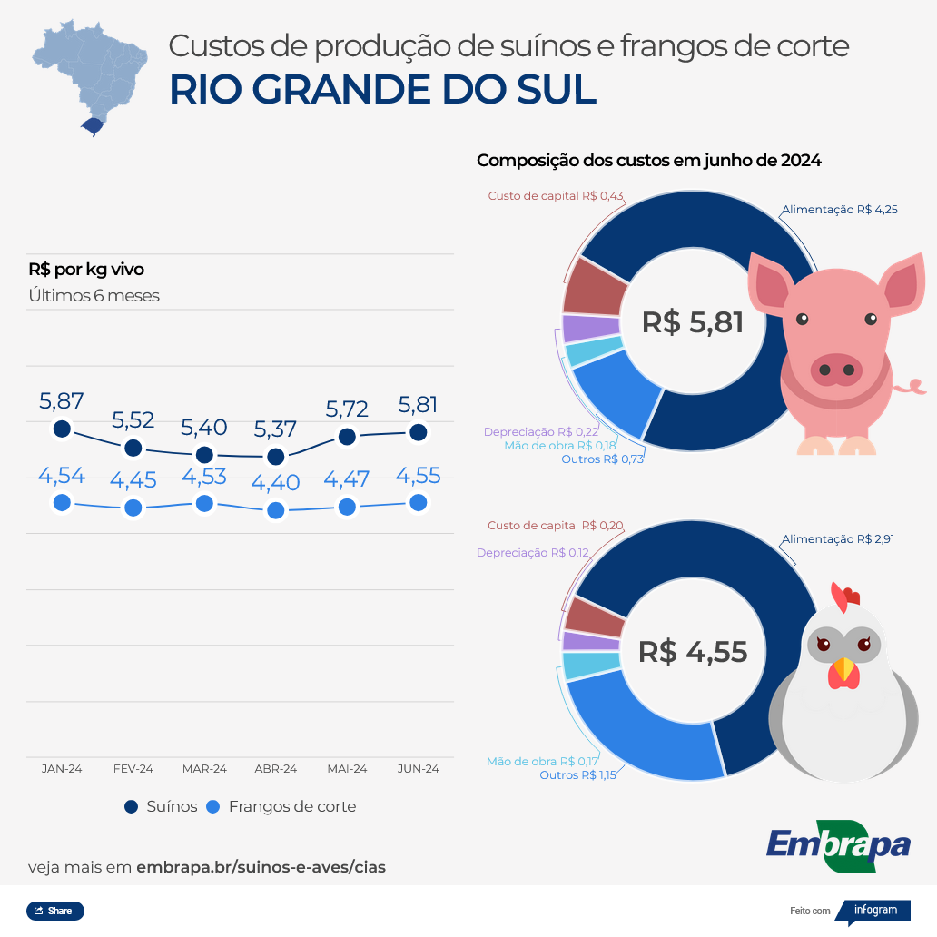 Os custos de produção de frangos de corte e suínos aumentaram significativamente em junho nos principais estados produtores e exportadores, conforme estudos da Embrapa Suínos e Aves divulgados em sua Central de Inteligência de Aves e Suínos (embrapa.br/suínos-e-aves/cias).